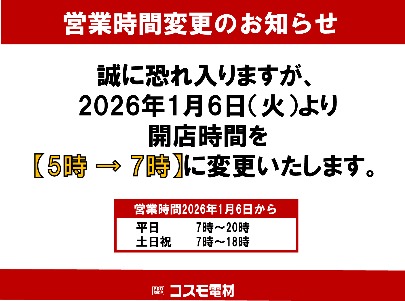 | 営業時間 | 平日 :5:00~20:00 土日祝:7:00~18:00 定休日:年末年始・棚卸実施日(年4回) 【お知らせ】 誠に恐れ入りますが、 2026年1月6日(火)より 開店時間を <5時 → 7時>に変更いたします。 |